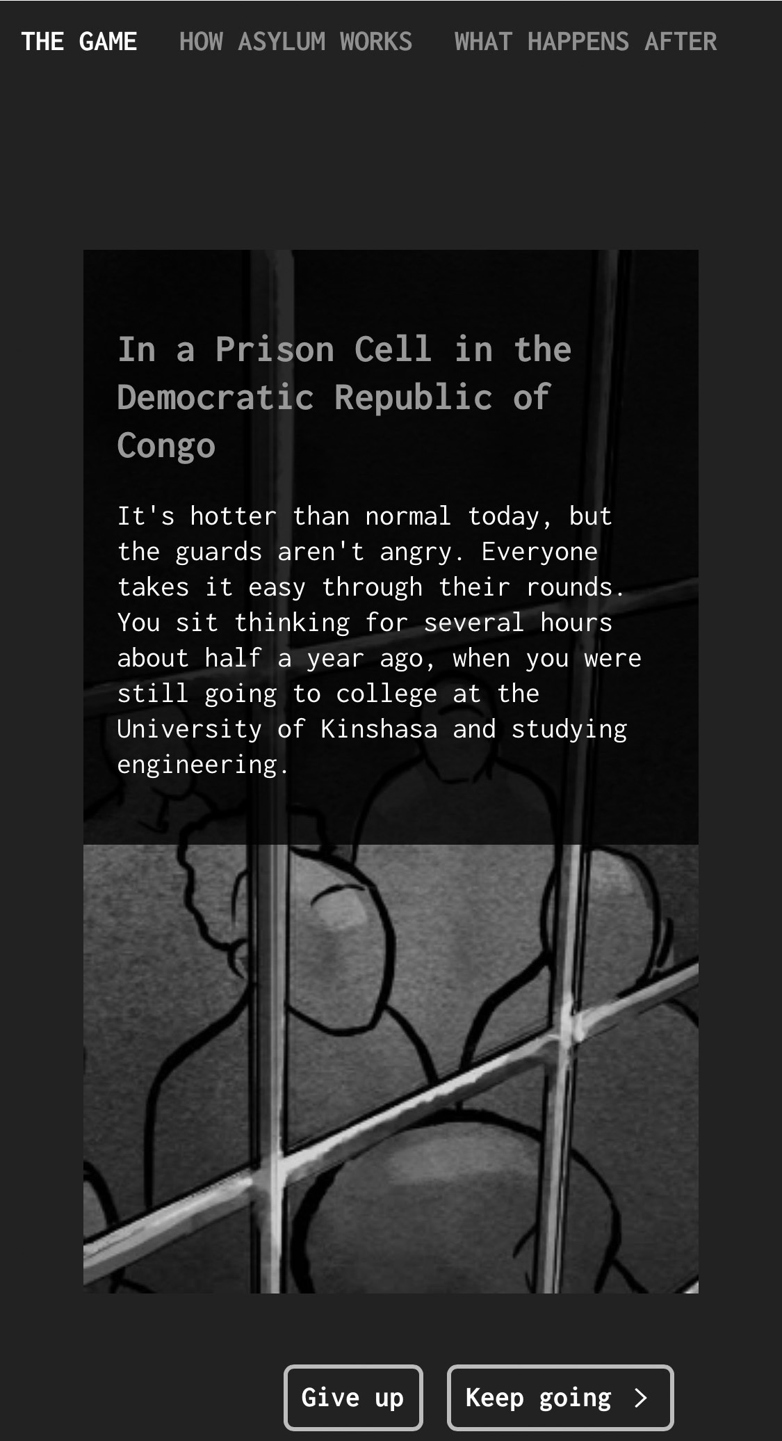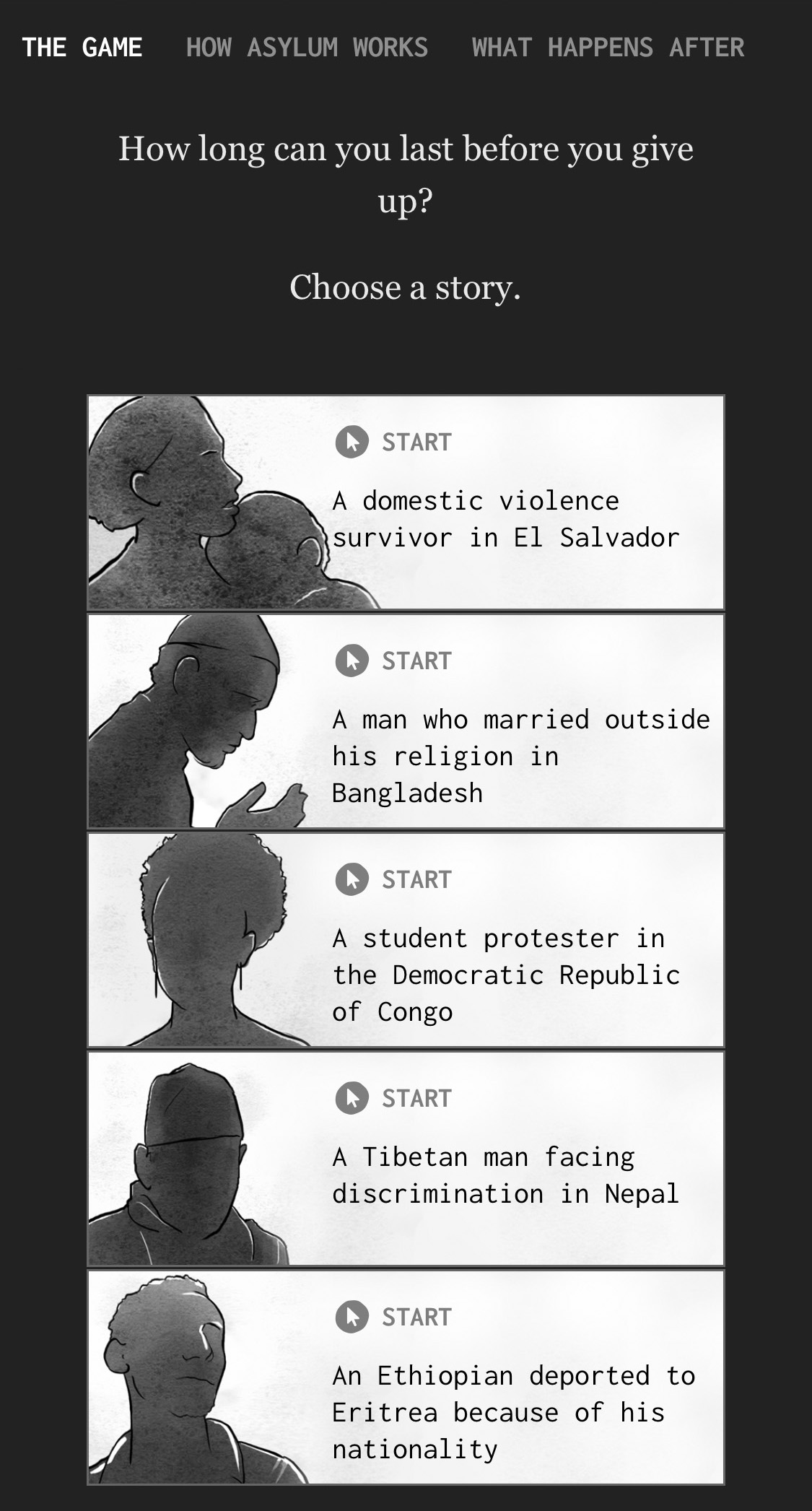 Based on real stories, The Waiting Game simulates the experience of someone seeking asylum in the United States. Players can follow the stories of five unnamed people, starting from the moment they decide to flee their home countries. What they all have in common is the wish to get asylum. However, the journey to get treated is long. As we follow the stories, we get to understand the hardships of asylum-seekers endure.